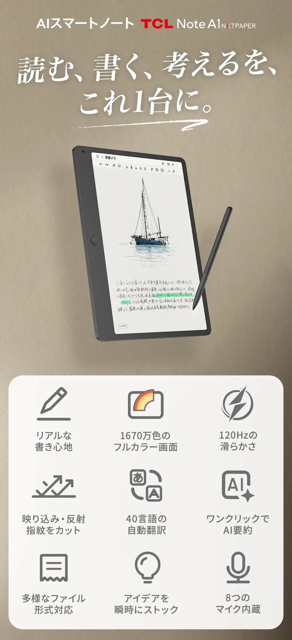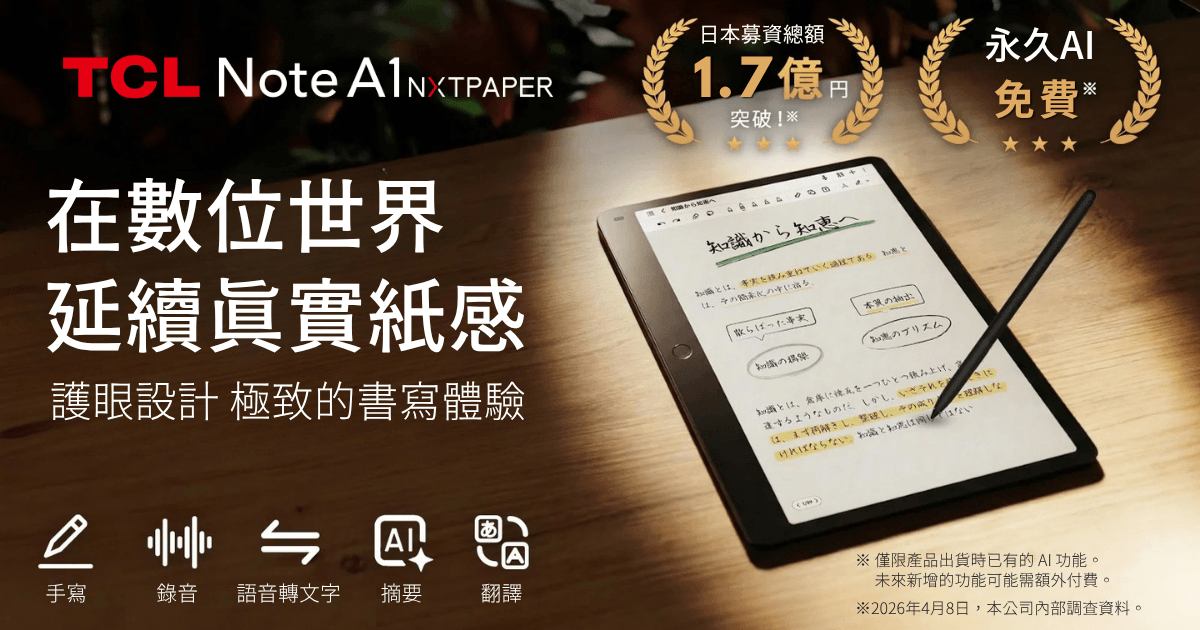 現在,您需要的不再只是一個螢幕,而是能將珍貴靈感從雜念中守護下來、喚醒創造力的最佳夥伴。「不干擾思考的速度」與「宛如紙張般的沉浸感」。將這份理想具象化的產品,正是TCL Note A1 NXTPAPER。