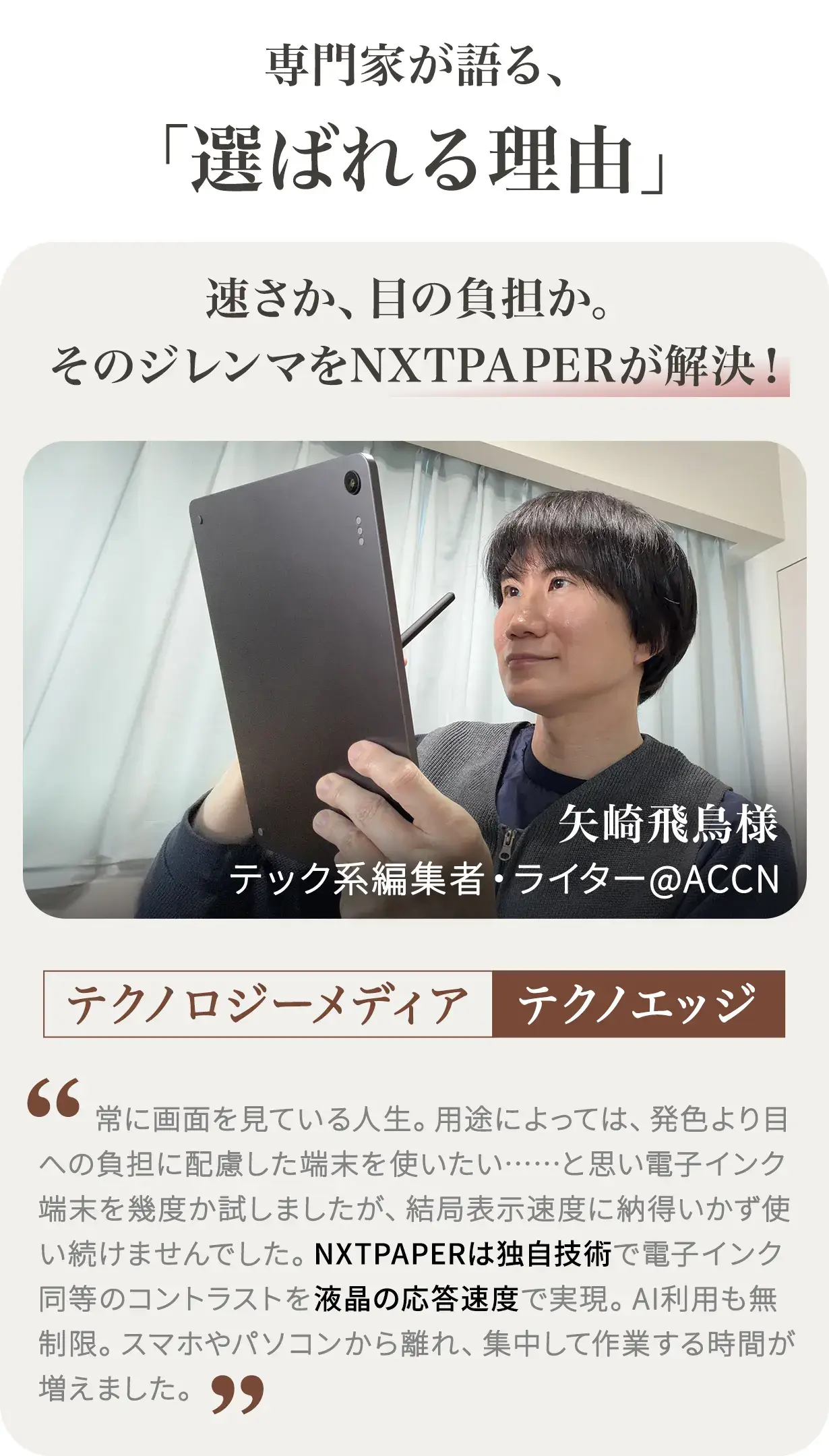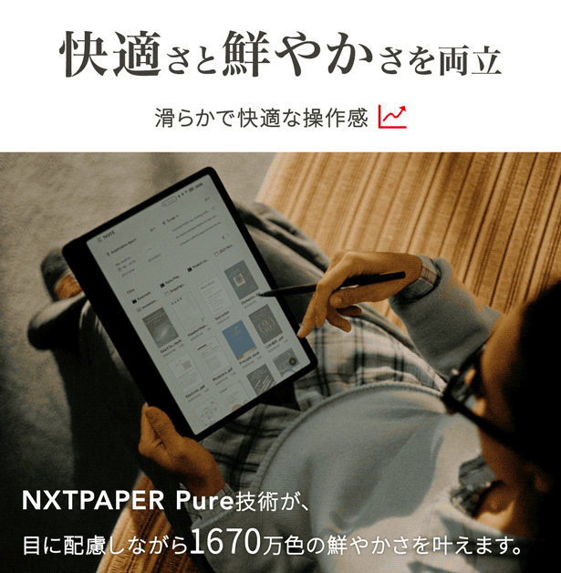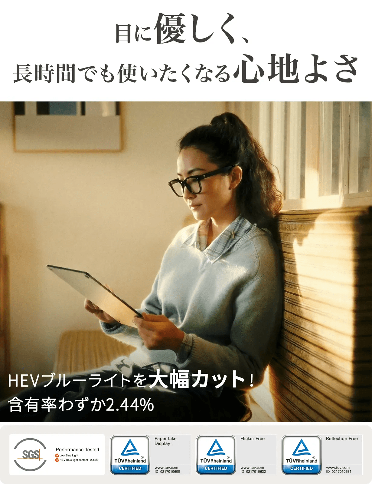 除了降低藍光(SGS/TÜV 認證)之外,更採用了經過抑制螢幕閃爍處理的顯示器。專為長時間閱讀與筆記而設計,有效減輕眼部負擔。