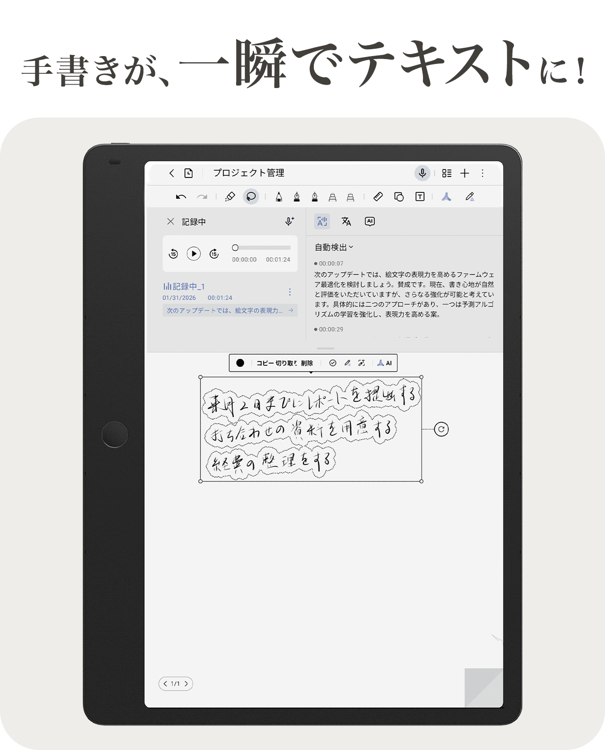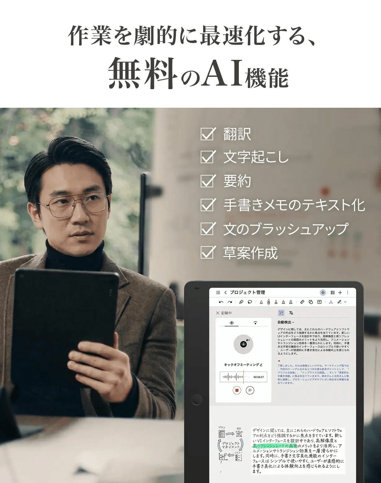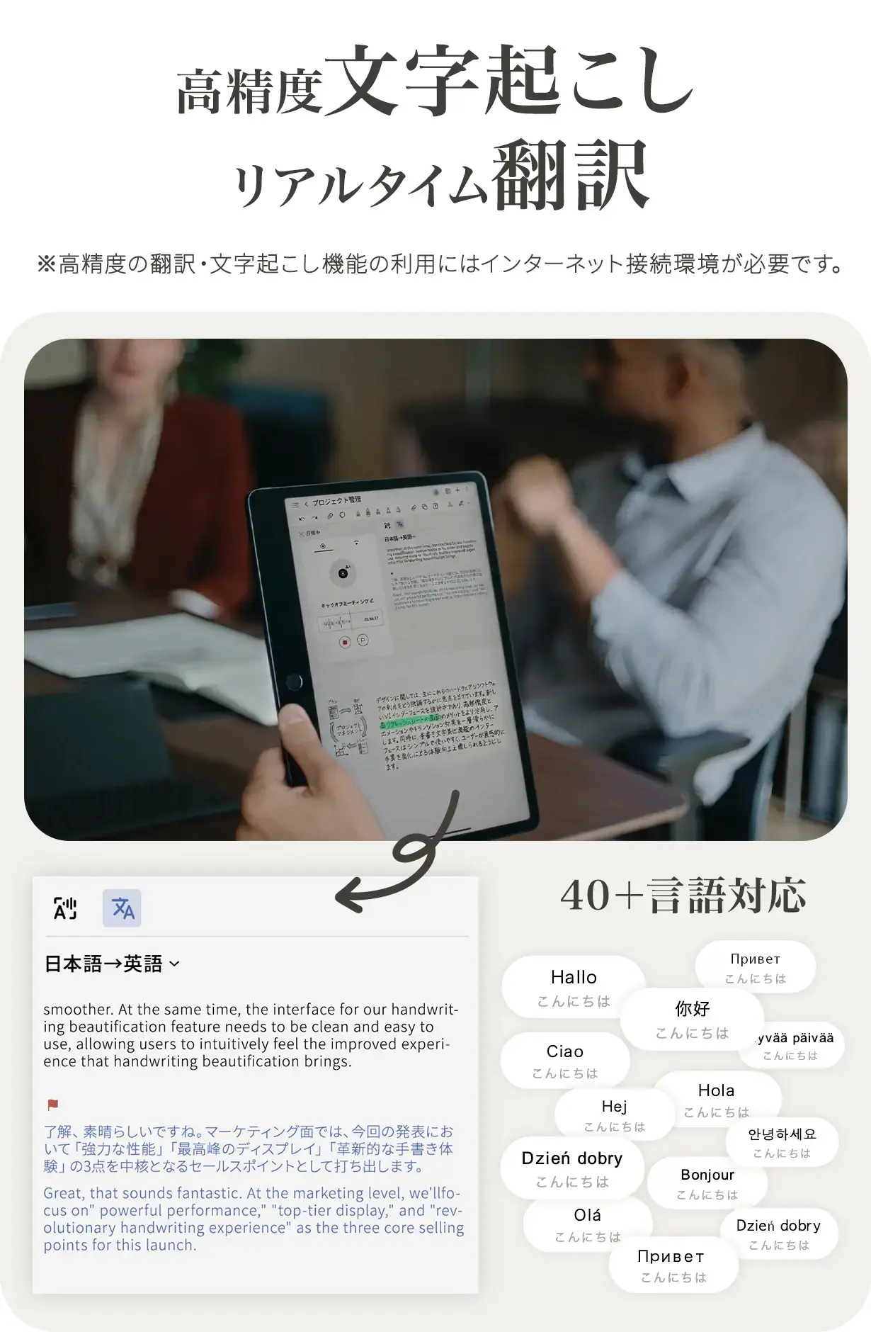 將會議或講座的音訊,準確轉錄並記錄為文字資料。具備極高的精準度,支援 10 種以上的語言、方言與口音,能將會議內容轉換為文字。支援包含中文、日文在內等 40 種以上的語言,可於現場即時翻譯會議或對話內容。