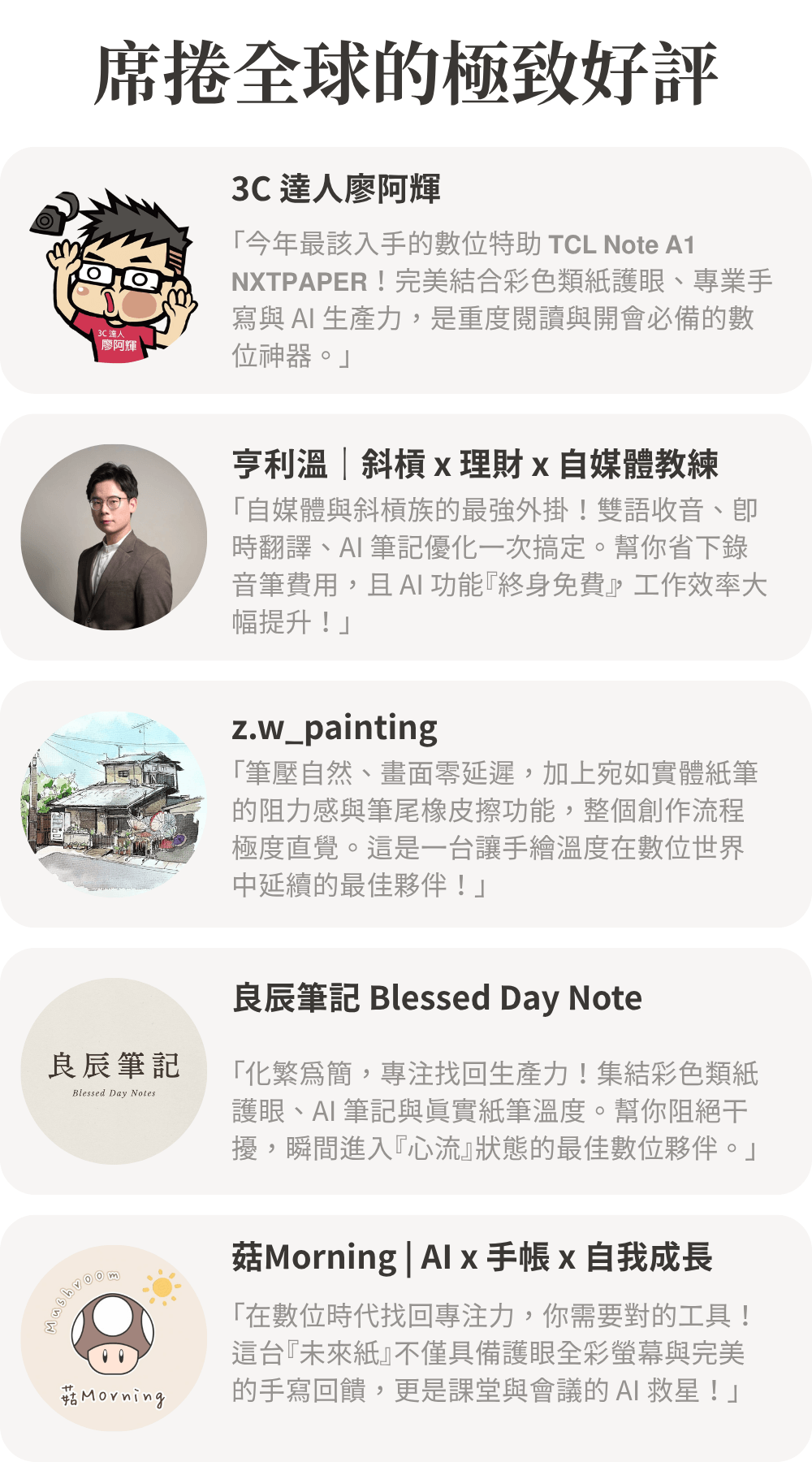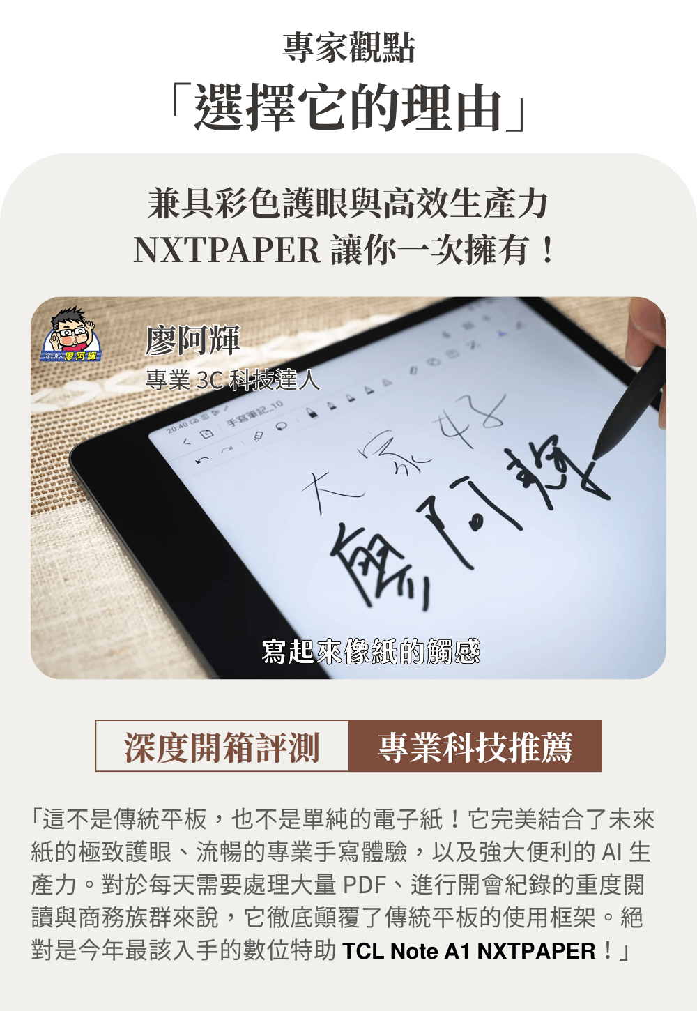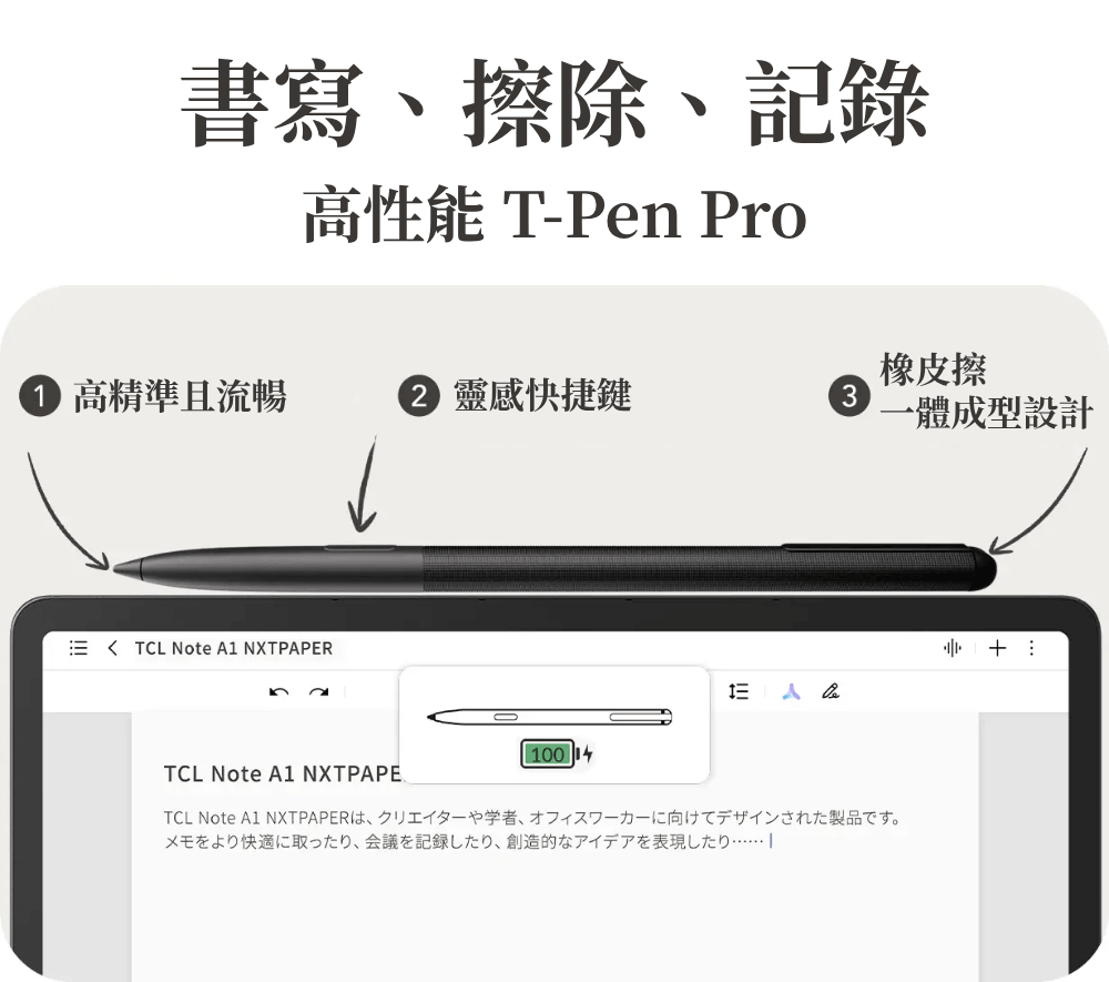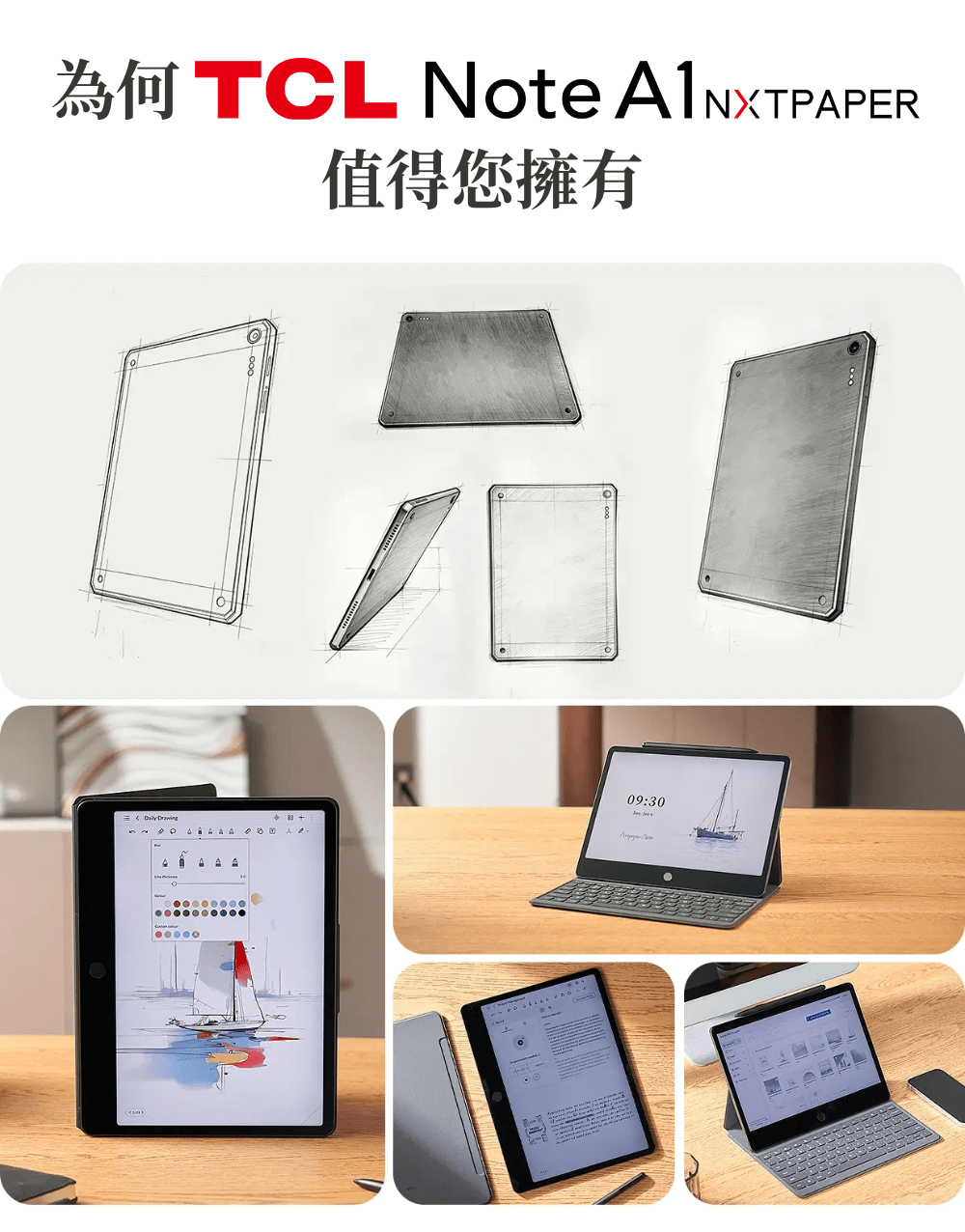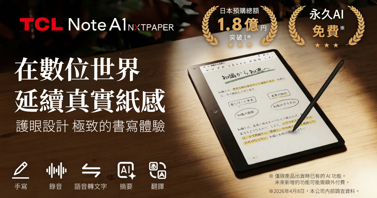 現在,您需要的不再只是一個螢幕,而是能將珍貴靈感從雜念中守護下來、喚醒創造力的最佳夥伴。「不干擾思考的速度」與「宛如紙張般的沉浸感」。將這份理想具象化的產品,正是TCL Note A1 NXTPAPER。