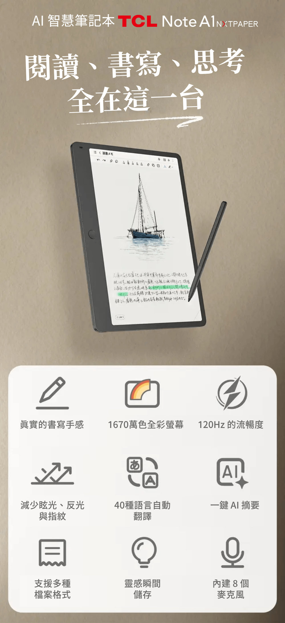 真正的生產力,始於不被打擾的「沉浸」,並在流暢無礙的「清晰思考」中淬鍊而成。然而,傳統裝置卻存在著兩難:多功能平板充斥著通知與誘惑,而傳統電子紙的遲緩反應卻又時常打斷思緒。