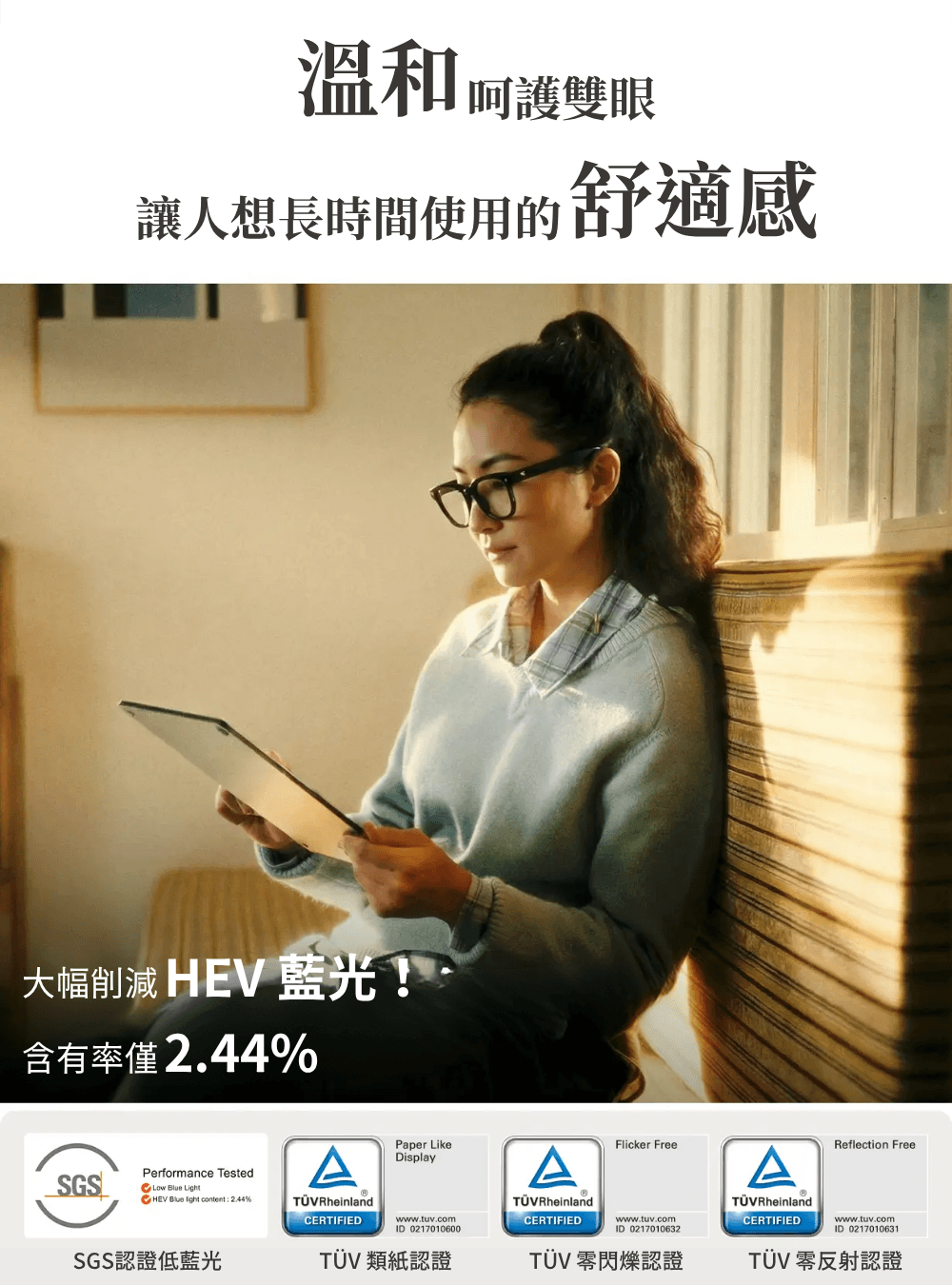 除了降低藍光(SGS/TÜV 認證)之外,更採用了經過抑制螢幕閃爍處理的顯示器。專為長時間閱讀與筆記而設計,有效減輕眼部負擔。