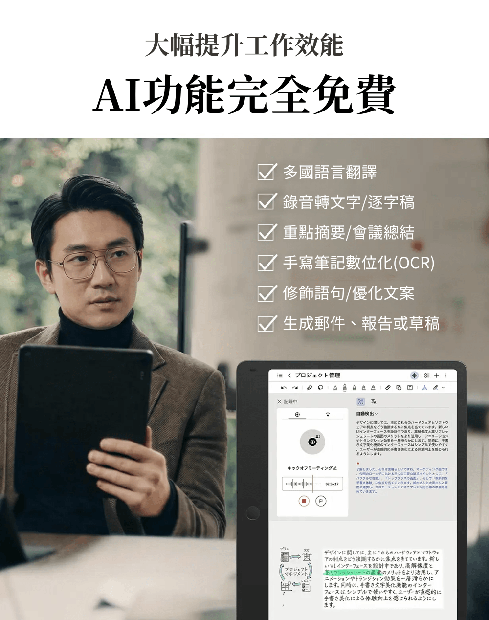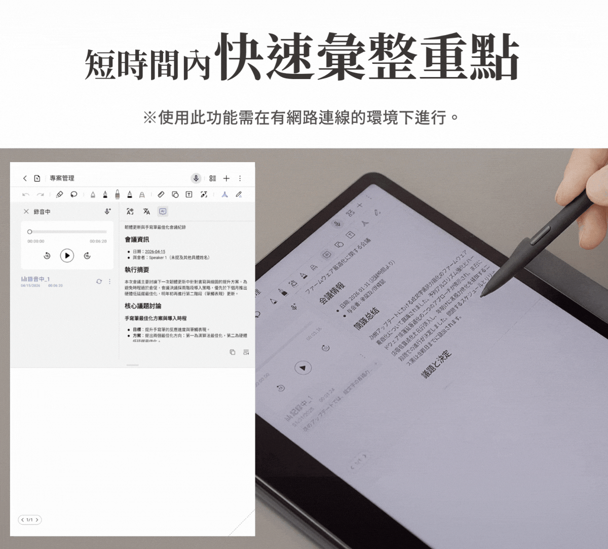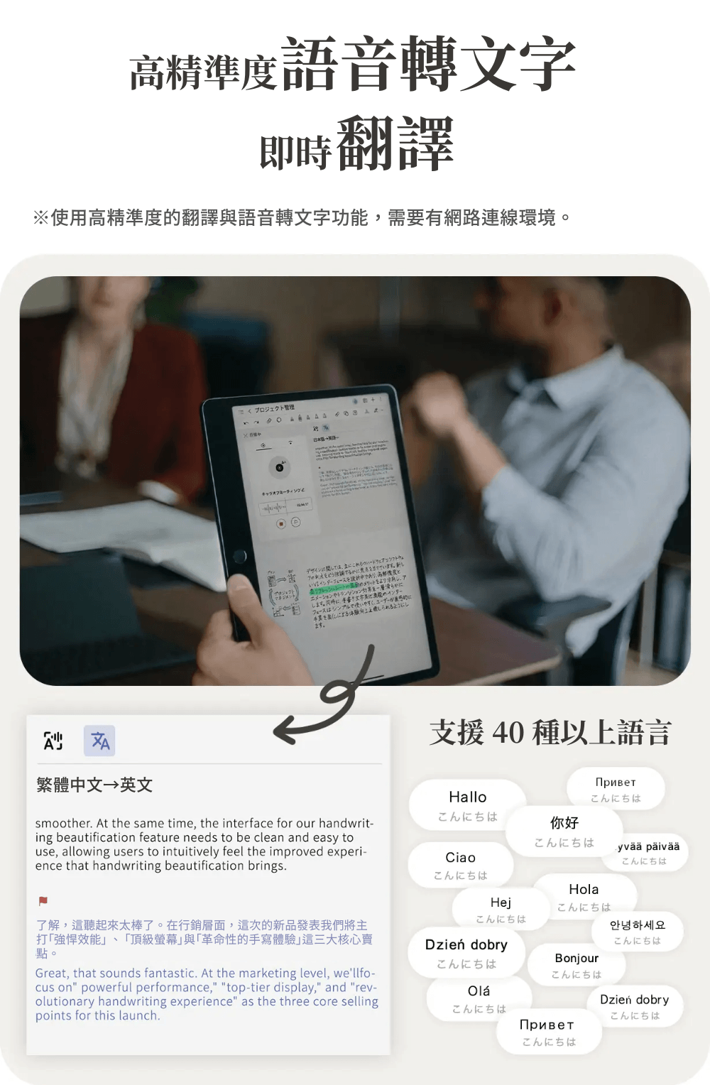 將會議或講座的音訊,準確轉錄並記錄為文字資料。具備極高的精準度,支援 10 種以上的語言、方言與口音,能將會議內容轉換為文字。支援包含中文、日文在內等 40 種以上的語言,可於現場即時翻譯會議或對話內容。
