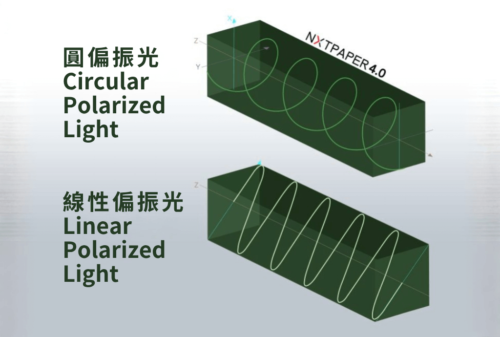 光線的偏振方式對視覺舒適度有著決定性的影響。多數電子顯示器採用 線性偏振光(LPL, Linear Polarized Light,其電場僅侷限於沿著光線傳播方向的單一平面,雖能穩定控制光線方向,但長時間觀看容易造成畫面刺眼與眼睛疲勞。