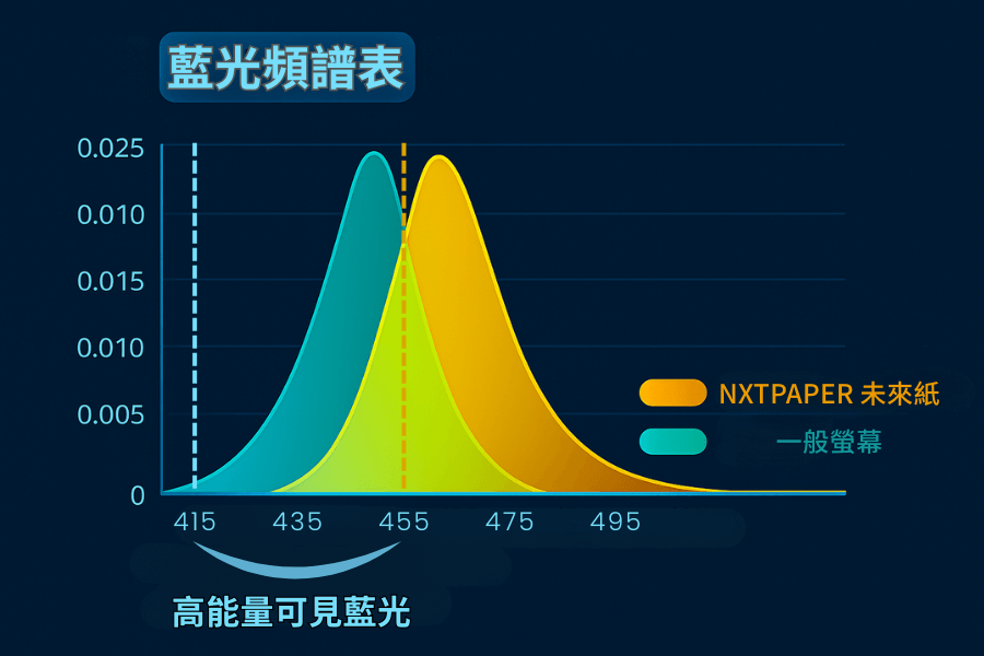 此技術的核心,在於精準調校 LED 的藍光光譜,將藍光峰值移至 457–462.5 奈米 的安全波段。根據光譜分析顯示,於有害藍光範圍(415–455 奈米)內,TCL NXTPAPER 4.0 的短波藍光比例已降至僅 3.41%(註1),相較傳統電子顯示技術大幅降低。